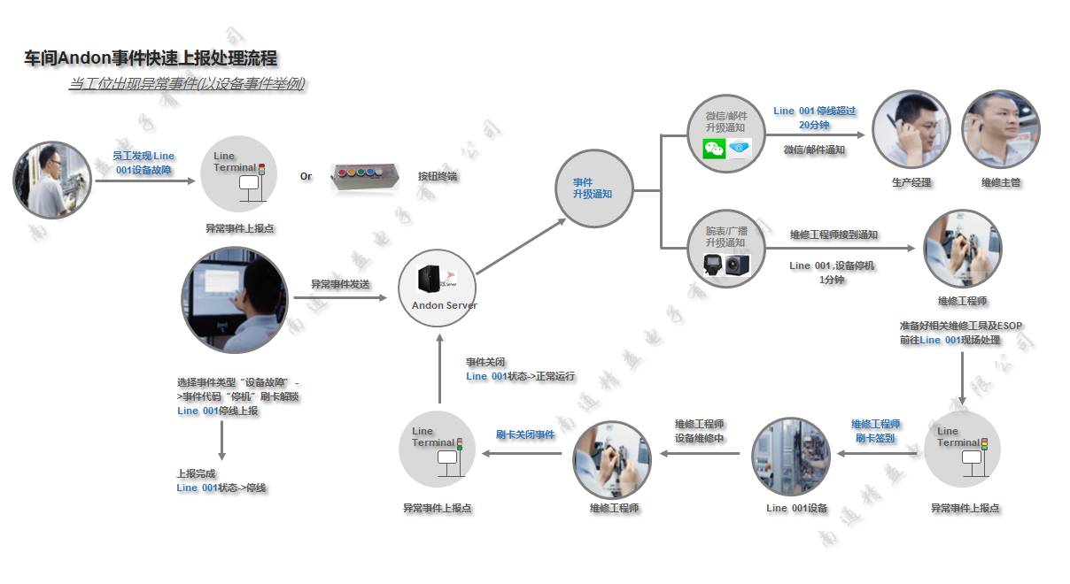 當(dāng)產(chǎn)線或工位發(fā)生異常事件時(一般分類:設(shè)備、物料、質(zhì)量、工藝、安全等);工人按下對應(yīng)“異常按鍵”,可以通過短信、微信、內(nèi)部郵件、智能腕表、手機APP、警示燈塔(多色報警燈)、目視化看板(LED看板、燈箱看板、電視機看板等)、對講機平臺、廣播平臺等方式通知相關(guān)責(zé)任人; 實現(xiàn)問題快速通知,做到事件快速響應(yīng)、迅速處理的目標(biāo)。Andon系統(tǒng)實時監(jiān)控事件過程(事件的發(fā)起時間、事件的響應(yīng)時間、以及事件處理時間);在一定時間規(guī)則內(nèi)未響應(yīng)或未處理結(jié)束,Andon系統(tǒng)將自動逐級匯報對應(yīng)部門主管、GM(General Manager)。同時Andon系統(tǒng)自動記錄相關(guān)處理數(shù)據(jù),還可以進行事件的原因、事件的對策維護等; 生成Andon系統(tǒng)知識庫,Andon系統(tǒng)自動進行多維度統(tǒng)計分析,生成標(biāo)準(zhǔn)的統(tǒng)計報表。