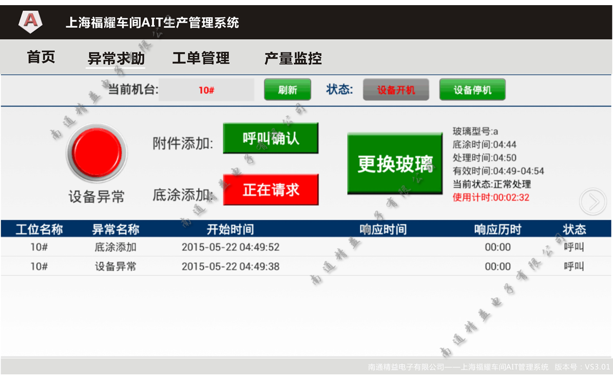 上海福耀玻汽車(chē)璃有限公司1樓的2個(gè)車(chē)間(PVC車(chē)間和天窗車(chē)間),項(xiàng)目集成了生產(chǎn)計(jì)劃管理、產(chǎn)量采集、設(shè)備故障求助、底涂添加(底涂失效管控)、附件添加(附件失效管控)、前底涂時(shí)間錄入(前底涂失效管控)、生產(chǎn)開(kāi)始\結(jié)束信息管控等方面。
